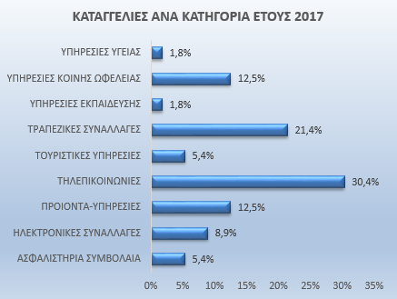Σημειώνουμε πως η κατηγορία «Τηλεπικοινωνίες» συγκέντρωσε, για το έτος 2017, τις περισσότερες καταγγελίες καταναλωτών, αγγίζοντας το 30,4% επί του συνόλου των καταγγελιών, ξεπερνώντας ακόμα και τις καταγγελίες σχετικά με τραπεζικές συναλλαγές (21,4%).