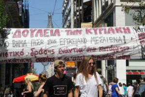 Φωνάζοντας συνθήματα όπως «κάτω τα χέρια από τις Κυριακές και τις ζωές μας» και «ούτε 52, ούτε 7, ποτέ την Κυριακή τα μαγαζιά ανοιχτά» πλήθος πολιτών διαδήλωσε στο κέντρο της Αθήνας ενάντια στην προγραμματισμένη λειτουργία των καταστημάτων την Κυριακή, από τις 11 το πρωί μέχρι τις 8 το βράδυ.