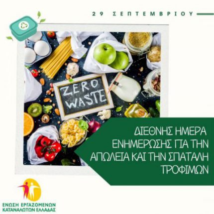 Η Ένωση Εργαζομένων Καταναλωτών Ελλάδας γιορτάζει τη Διεθνή Ημέρα Ενημέρωσης για την Απώλεια και τη Σπατάλη Τροφίμων, στις 29 Σεπτεμβρίου, και καλεί όλους τους καταναλωτές να συμβάλουν για ένα πιο βιώσιμο και δίκαιο σύστημα τροφίμων. Η ημέρα αυτή υπενθυμίζει τη σημασία της διαχείρισης των τροφίμων με υπεύθυνο τρόπο, ώστε να προστατεύσουμε το περιβάλλον, να υποστηρίξουμε την οικονομία και να διασφαλίσουμε την επισιτιστική ασφάλεια.