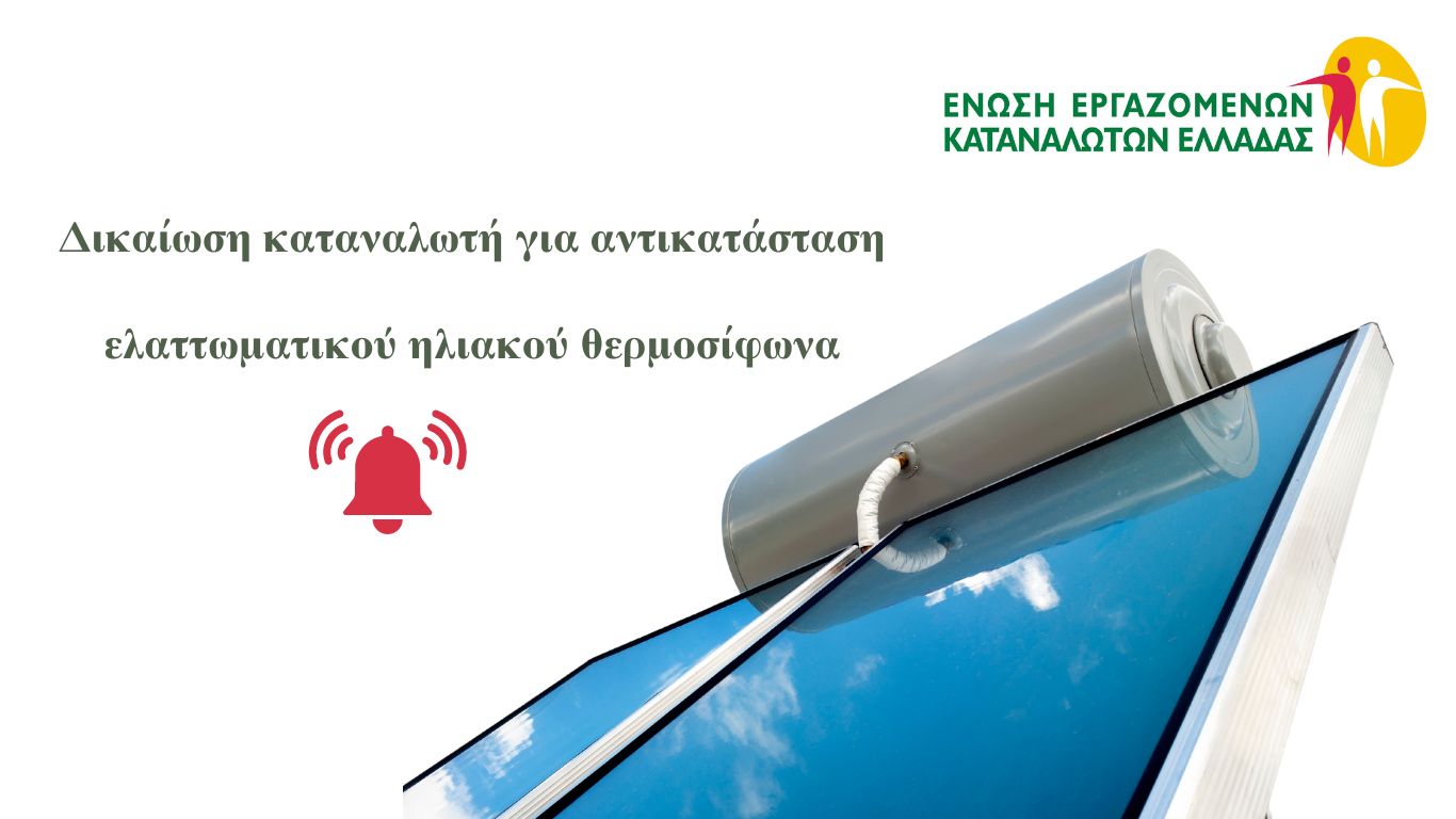 Μετά από επιτυχημένη παρέμβαση της ΕΕΚΕ, καταναλωτής – δικαιούχος επιταγής (voucher) στο πλαίσιο Προγράμματος «ΑΝΑΚΥΚΛΩΝΩ-ΑΛΛΑΖΩ ΘΕΡΜΟΣΙΦΩΝΑ» του Υπουργείου Περιβάλλοντος και Ενέργειας, δικαιώθηκε στη διαφορά του με μεγάλη αλυσίδα ηλεκτρονικών συσκευών από την οποία είχε αγοράσει ηλιακό θερμοσίφωνα.