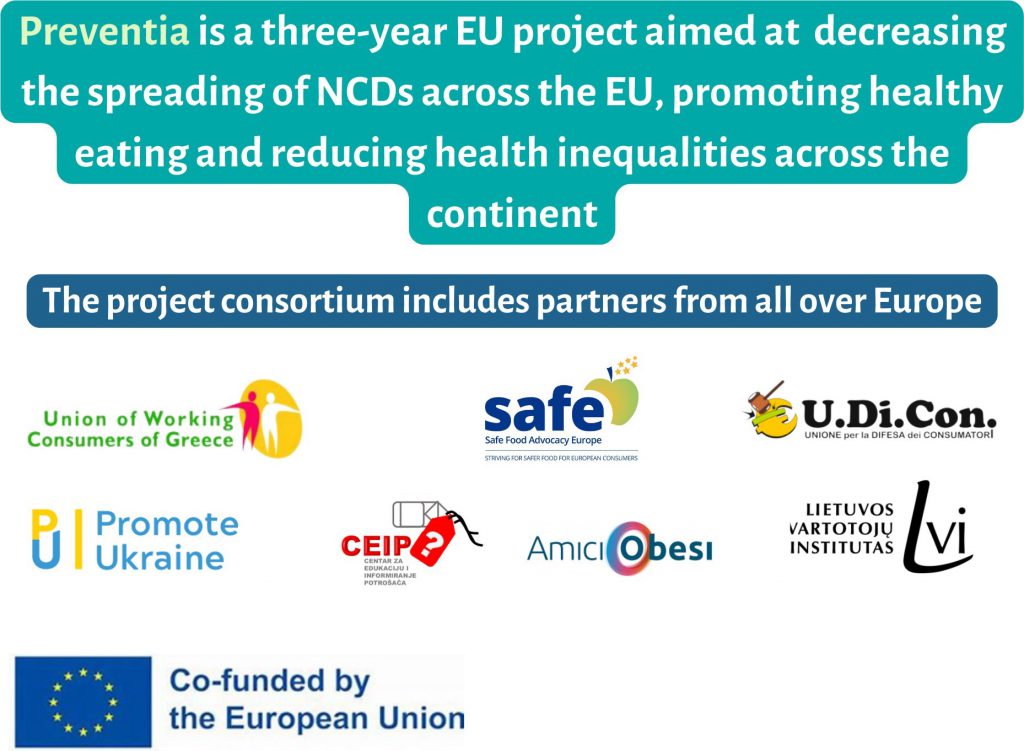 The Preventia project is coordinated by Safe Food Advocacy Europe, in cooperation with a consortium of partners from across Europe, including the Consumer Education and Information Center (Croatia), the Lithuanian Consumer Institute (Lithuania), the Union for Working Consumers of Greece (Greece), the Consumers Defense Union (Italy), Amici Obesi (Italy) and Promote Ukraine (Belgium).