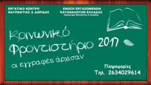 Το Ε.Κ.Ν.Δ. και η Ένωση Εργαζομένων Καταναλωτών Ελλάδας-Παράρτημα Ναυπακτίας & Δωρίδας ανακοινώνουν ότι ξεκίνησαν οι εγγραφές του Κοινωνικού Φροντιστηρίου για το σχολικό έτος 2017-2018 παρέχοντας δωρεάν ενισχυτική διδασκαλία σε μαθητές Γυμνασίου και Λυκείου οικογενειών που αντιμετωπίζουν οικονομικές δυσκολίες.