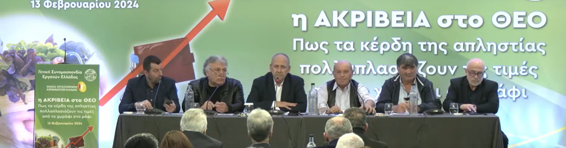 Με επιτυχία ολοκληρώθηκε η εκδήλωση της ΓΣΕΕ και της Ένωσης Εργαζομένων Καταναλωτών Ελλάδας με τίτλο “Η Ακρίβεια στο Θεό- Πως τα κέρδη της απληστίας πολλαπλασιάζουν τις τιμές από το χωράφι στο ράφι”.