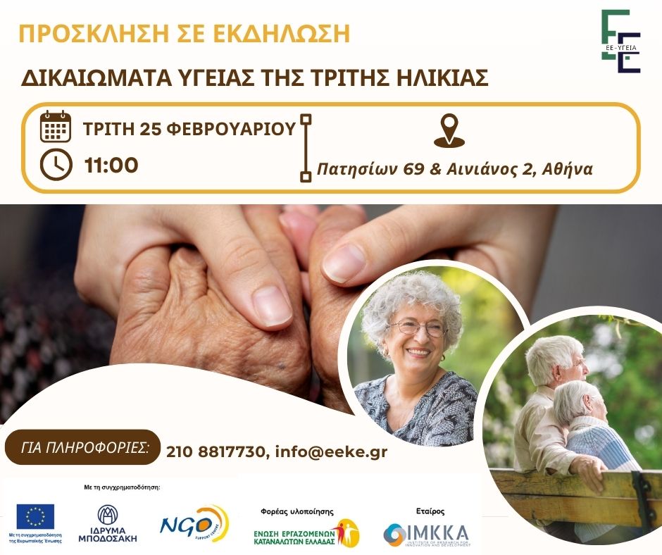 Η Ένωση Εργαζομένων Καταναλωτών Ελλάδας και το Ινστιτούτο Μελετών Καινοτομίας και Ανάπτυξης, σας καλεί σε εκδήλωση με θέμα: Δικαιώματα Υγείας της Τρίτης Ηλικίας την Τρίτη 25 Φεβρουαρίου στις 11:00, στο αμφιθέατρο της ΓΣΕΕ (Πατησίων 69 και Αινιάνος 2), η οποία πραγματοποιείται στο πλαίσιο του έργου ΕΕ-Υγεία του προγράμματος BUILD – Building a robust and democratic civic space όπου θα παρουσιαστεί το έργο και τα αποτελέσματα του.