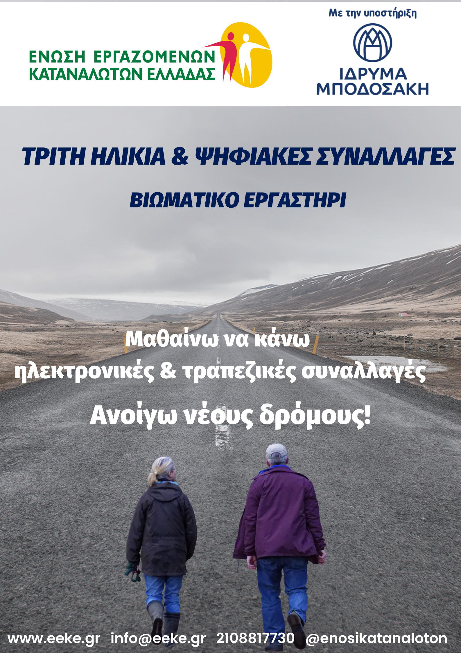 Το έργο «Βιωματικό Εργαστήρι: Τρίτη Ηλικία & Ψηφιακές Συναλλαγές» χρηματοδοτείται από το Ίδρυμα Μποδοσάκη και αποτελεί επέκταση και αναβάθμιση του έργου Ψηφιακές Κοινότητες Τρίτης Ηλικίας που υλοποιήθηκε το 2020 και σκοπό έχει να βελτιώσει άμεσα την ποιότητα διαβίωσης των επωφελουμένων και να συμβάλλει στην προστασία του εισοδήματος και της περιουσίας τους.