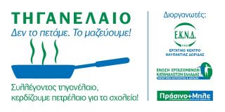 Σε συνεργασία με τα Δημοτικά Σχολεία και Γυμνάσια της Ναυπάκτου καλούνται μαθητές και γονείς να φέρουν στο σχολείο τα χρησιμοποιημένα τηγανέλαια του σπιτιού τους, με στόχο να τα ανακυκλώσουμε και ανάλογα με την ποσότητα που θα συγκεντρώσει το κάθε σχολείο ως αντισταθμιστικό όφελος θα παραλάβει πετρέλαιο Θέρμανσης, καλύπτοντας μέρος των αναγκών του.