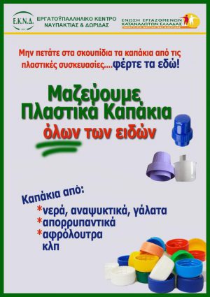 Το ΕΚΝΔ και η ΕΕΚΕ Παράρτημα Ν&Δ συνεχίζουν την πρωτοβουλία συλλογής πλαστικών καπακιών και καλούμε τις συμπολίτες μας και τις επιχειρήσεις της περιοχής να συνδράμουν με πλαστικά καπάκια όλων των συσκευασιών (νερού, χυμού, γάλακτος, απορρυπαντικών, αναψυκτικού κλπ).