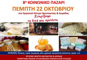 Το Ε.Κ.Ν.Δ. – Εργατουπαλληλικό Κέντρο Ναυπακτίας – Δωρίδος  και η  Ένωση Εργαζομένων Καταναλωτών Ελλάδας – Παράρτημα Ναυπακτίας & Δωρίδας μετά την επιτυχημένη διοργάνωση 7 Κοινωνικών Παζαριών, τα οποία επισκέφθηκαν εκατοντάδες πολίτες και επισκέπτες της ευρύτερης περιοχής, διοργανώνουν το 8ο Κοινωνικό Παζάρι.